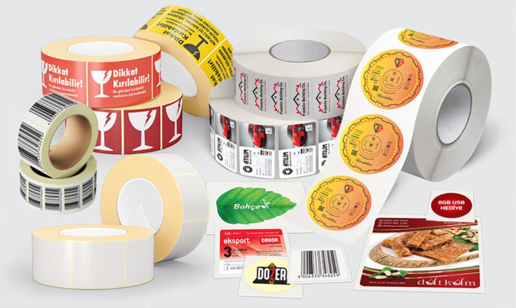 Etiketler, ürün adı, içerik bilgileri, kullanım talimatları gibi önemli bilgileri taşır ve birçok farklı malzeme ve baskı tekniğiyle üretilebilir. Plastik, kağıt, metalik folyo, gofre veya şeffaf etiket gibi seçeneklerle ürününüzün tarzına uygun hale getirilebilir.