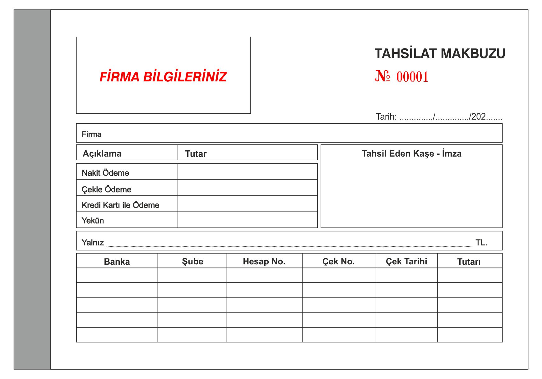 Tahsilat makbuzunda genellikle ödeme tarihi, miktar, ödeme yöntemi, müşteri ve firma bilgileri yer alır. Firmanızın logosu ve iletişim bilgileriyle tasarlanmış tahsilat makbuzları, resmi işlemlerinizde profesyonel bir izlenim yaratır ve kayıtlarınızın takibini kolaylaştırır.